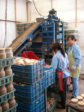 市双益菇业有限公司十分注重科技创新,近年来企业的自主研发能力不断提升,相继成功研制了大型自动拌料机、自动搔菌机等食用菌生产设备。图为工人正在操作公司自行研制的自动装瓶机。 记者 吴向东 通讯员 许年林 摄影报道