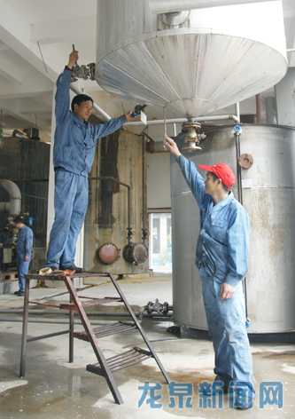 今年,浙江龙鑫化工有限公司为应对金融危机,着手生产目前价格只升不降的产品氢醇。目前,整套生产设备已经安装完毕,工人们在作生产前的调试工作。 记者 姜爱华 摄影报道