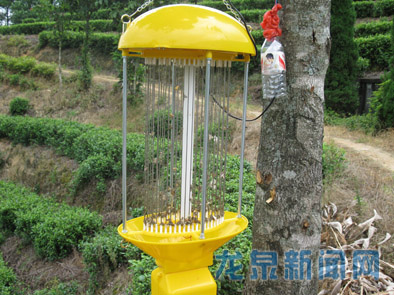 为了减少茶园病虫害发生,提高茶叶品质,今年以来,市农业局先后引进了信息素黄板、频振式杀虫灯等先进害虫防治技术,分别在凤阳春、金福茶业、八都镇章府会村等茶叶基地开展防治害虫的示范推广工作。图为频振式杀虫灯。 通讯员 周陈清 摄影报道