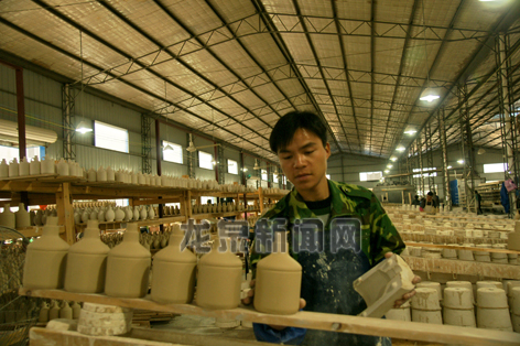 龙泉青瓷“申遗”成功后,给青瓷产业带来了无限商机。今年,许多名酒企业纷纷下单求购青瓷酒瓶,金宏瓷厂作为青瓷酒瓶行业的龙头企业,更是订单不断。该公司负责人预计今年产值将在去年4000多万元的基础上翻一番。图为该厂工人在赶制酒瓶。