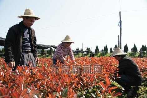 连日来,在浙江绿峰农林科技有限公司的苗木基地里,数千株红叶石楠苗木新发出的嫩叶,呈现出鲜艳的红色,在绿草和绿叶的映衬下,显得灿烂如霞,生机勃勃,引来求购客商无数。图为工人们在基地里培育苗木。记者 姜爱华 摄影报道