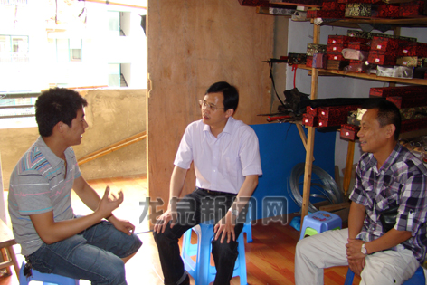 叶晓勇先后走访大学生徐力军、查长伟、陶怡的创业情况。每到一处,叶晓勇听取了他们的创业经历,同时鼓励他们遇到困难时不要气馁,贵在坚持。徐力军是来自宁波的大学生,毕业后和龙泉女朋友叶珺一起经营起了专卖龙泉青瓷的网店。目前,他们两人经营的“本土久久”主营青瓷茶具近300种,销售一直不错,他们也对自己经营的网店充满信心。