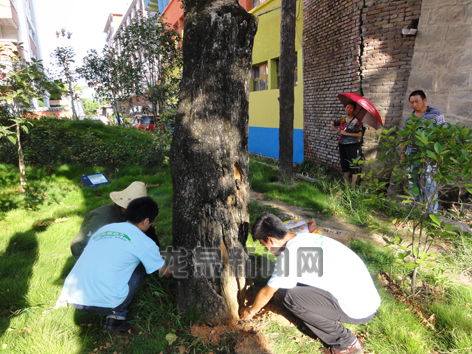 8月10日,市园林处邀请了2名专业人员,对育才银杏园的两株银杏进行了修补。据了解,这两株银杏的树龄分别为500年和400年,树干出现空洞。工作人员将去除树干腐烂部分,用树脂等材料填充,再涂上防水层等,保护树木。预计修复工作2天时间完成。