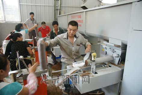 浙江晨光食品有限公司是一家专业从事香菇、木耳等农副产品生产、加工、销售的丽水市重点农业龙头企业,去年实现食用菌销售额达1.08亿元。日前,公司下属的兴晨食用菌合作社,今年投资160万元建成菌棒加工厂并投入使用,标志着该公式形成了从菌棒集约化加工-基地标准化管理-加工销售的产业链。图为工人正在制作菌棒。 记者 杨欢婷 摄影报道