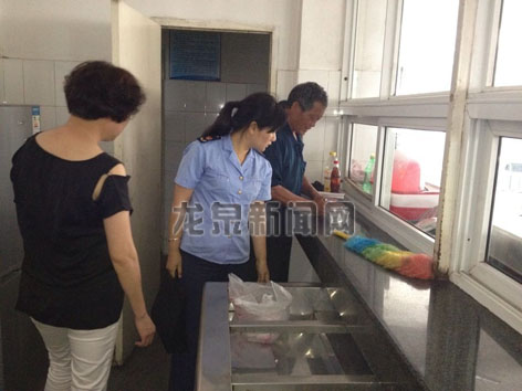 为确保今年中考顺利进行,给考生营造良好的学习和考试环境,近日,市市场监督管理局工作人员对龙泉二中、龙泉三中、龙泉四中、民族中学等学校食堂和周边的超市、副食品店,进行了一次拉网式的大检查。图为工作人员正在民族中学食堂检查。 记者 练丹 通讯员 寿冰 摄影报道