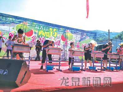 吃瓜比赛开始,儿童组、成人组先后比赛,参赛人员必须在指定时间内吃西瓜,以重量取胜。比赛相当激烈,只见大家“嗖嗖嗖”埋头吃西瓜,若秋风扫落叶般狂扫,惹得现场人们哈哈大笑。