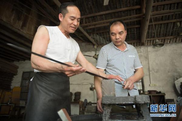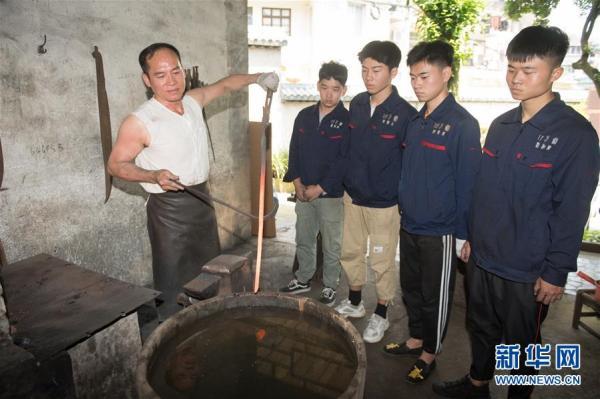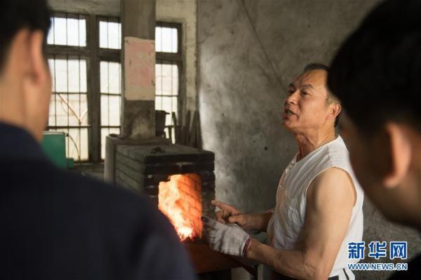 5月21日,郑国荣在“古越剑铺”向徒弟们传授宝剑淬火技艺。新华社记者翁忻旸摄