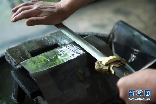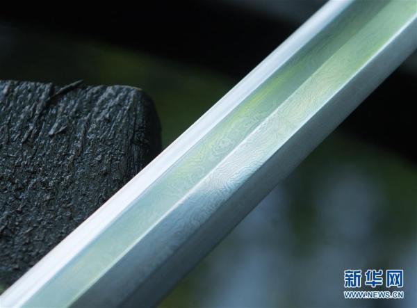 5月21日拍摄的一把正在磨制的龙泉宝剑,剑刃上的纹理经过数十次反复折叠锻打而成。新华社记者翁忻旸摄
