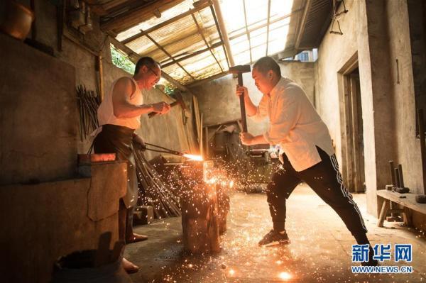 5月21日,郑国荣(左)和儿子在“古越剑铺”锻打坯料。新华社记者翁忻旸摄