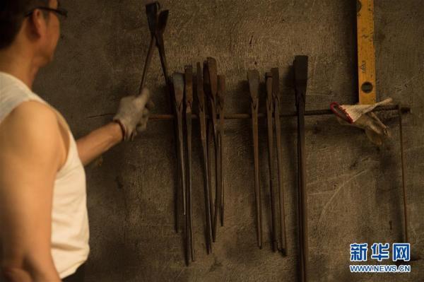 5月21日,郑国荣在“古越剑铺”取用工具锻打坯料。新华社记者翁忻旸摄