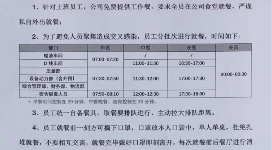 在该企业餐厅窗口上,张贴着疫情期间就餐管理公告,明确规定了就餐纪律。“我们要求所有的员工在食堂分批次进行就餐,并在餐桌上设置了隔板,一人一桌防止交叉感染。我们也严格要求工人们排队取餐时戴好口罩,保持安全距离,尽可能减少风险。”行政人事部相关负责人万芬芬说。